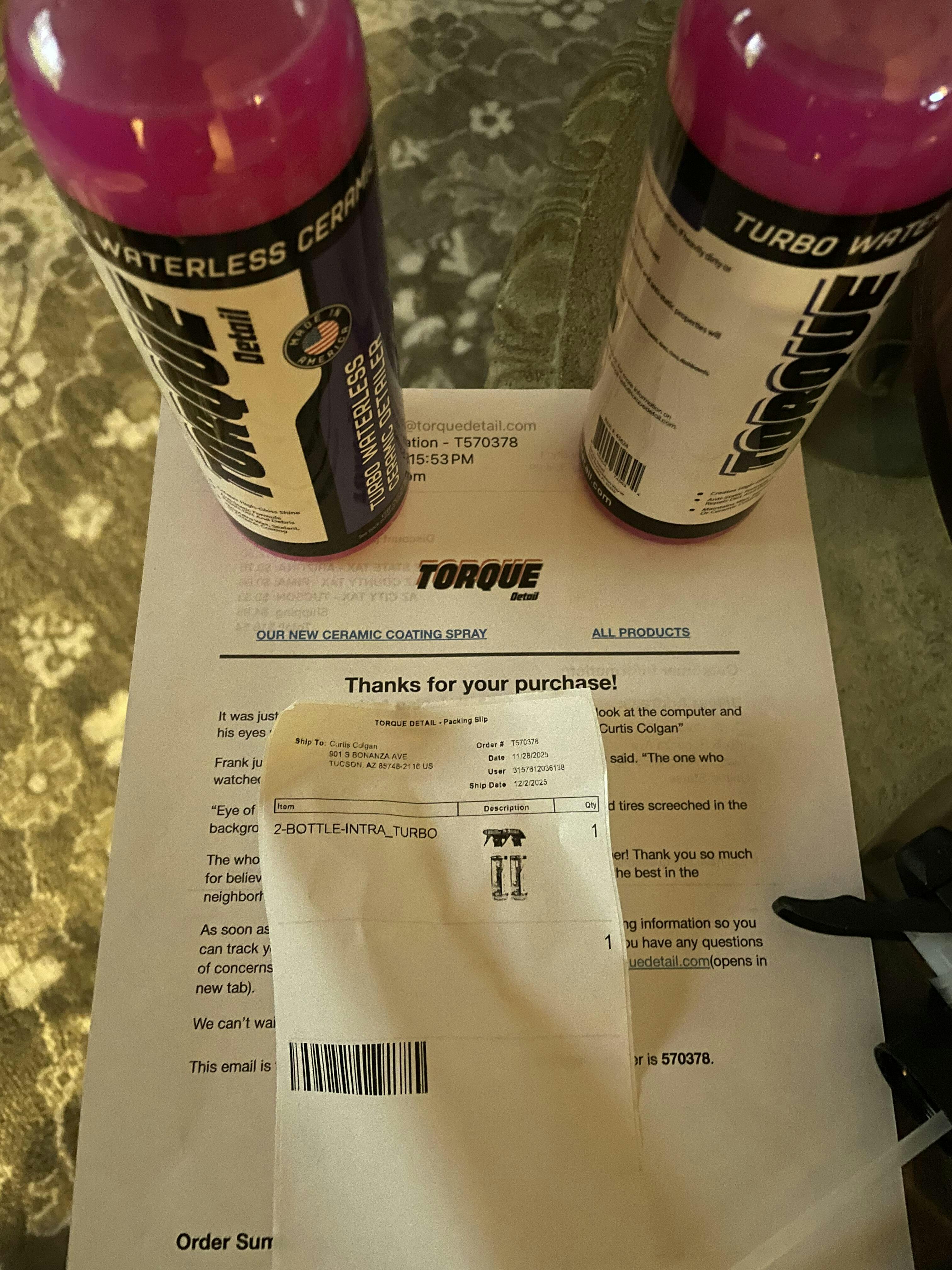 On Dec. 12th I received Turbo Waterless Ceramic Detailer refer to the 2-Ea e-mails and the 1-ea Text sent to [****]